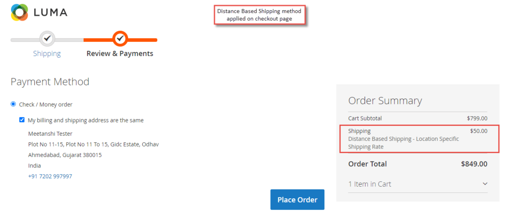 ● At the checkout page, the distance-based shipping rate is displayed under the order