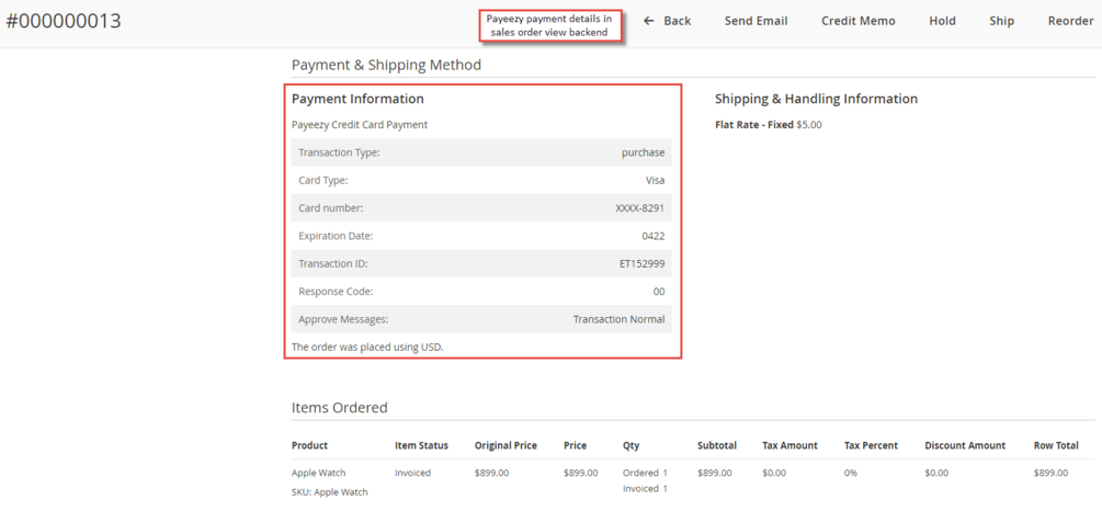 - Admin can navigate to Sales > Orders > Order View section in the backend to view the payment details.