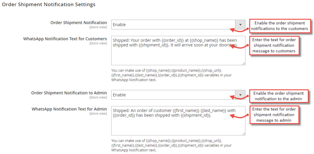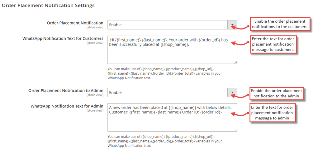 - Configure the notification messages using system variables like order_id, first_name, etc.