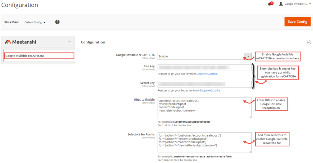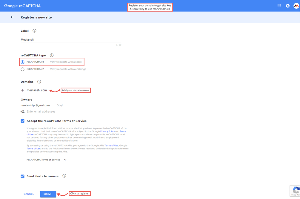 - Easily register with Google reCAPTCHA v3 at register with your domain name, accept the terms and conditions, and get the sitekey required for integration with Magento.